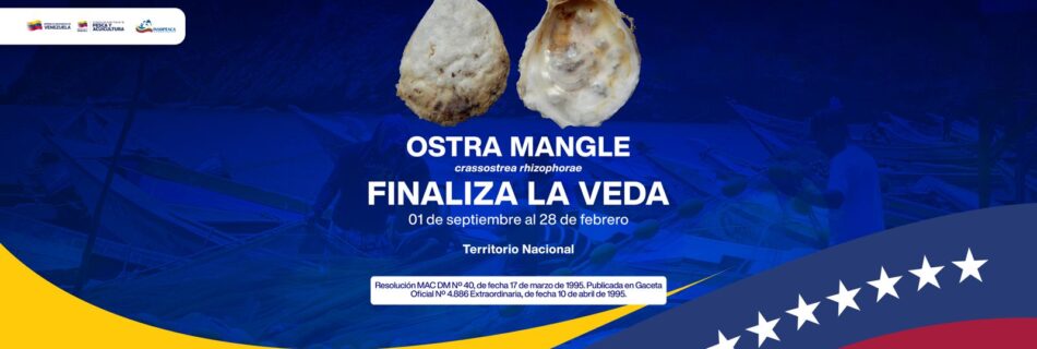 (Prensa Insopesca – 28/02/2026).- El Ministerio del Poder Popular de Pesca y Acuicultura (MPPPA), a través del Instituto Socialista de la Pesca y Acuicultura (INSOPESCA), informa a los pescadores, pescadoras y al pueblo venezolano que hoy culmina oficialmente el período de veda de la Ostra Mangle (Crassostrea rhizophorae) en todo el territorio nacional. A partir …